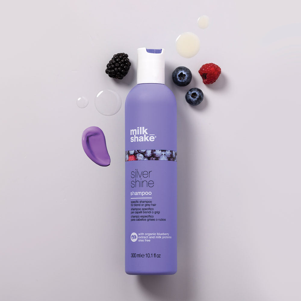 As it cleanses, milk_shake silver shine shampoo tones out unwanted brassiness in grey, white, & blonde hair. The longer you leave this purple shampoo in, the more vibrant highlights & silver tones will appear. Added milk proteins soften strands for a sleek, smooth finish. Post-wash, hair is left with essence of blueberry, blackberry, & raspberry. For an even bolder bright tone, use milk_shake silver shine conditioner after shampooing.