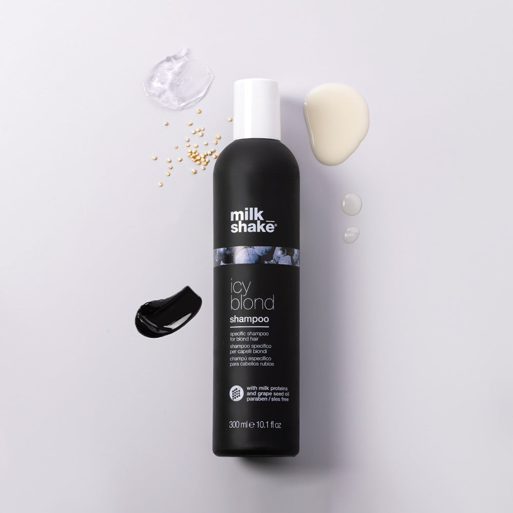 milk_shake icy blond shampoo's special black pigment reduces yellow, orange, & brassy tones in blonde hair. Every wash revitalizes hair strength & structure with the help of deep conditioning milk proteins. For added protection, integrity 41® prevents fading & supports longer-lasting color. Grapeseed oil nourishes the scalp & smooths hair for a sleek finished look.