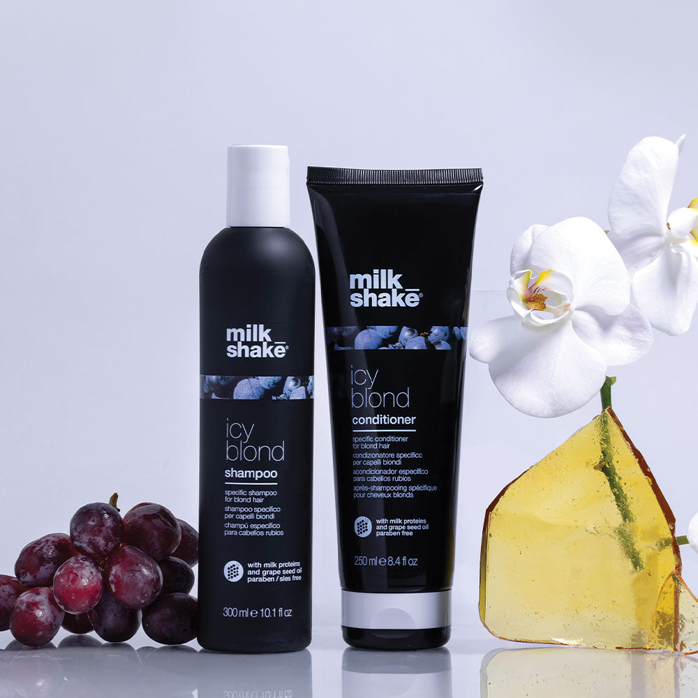Both milk_shake icy blond shampoo and conditioner are powered by a unique black pigment that neutralizes yellow, orange, and brassy tones in blonde hair. Each wash strengthens and revitalizes with deep-conditioning milk proteins, while Integrity 41® protects against fading for longer-lasting color. Grapeseed oil nourishes the scalp and smooths strands, leaving hair sleek, shiny, and refreshed.