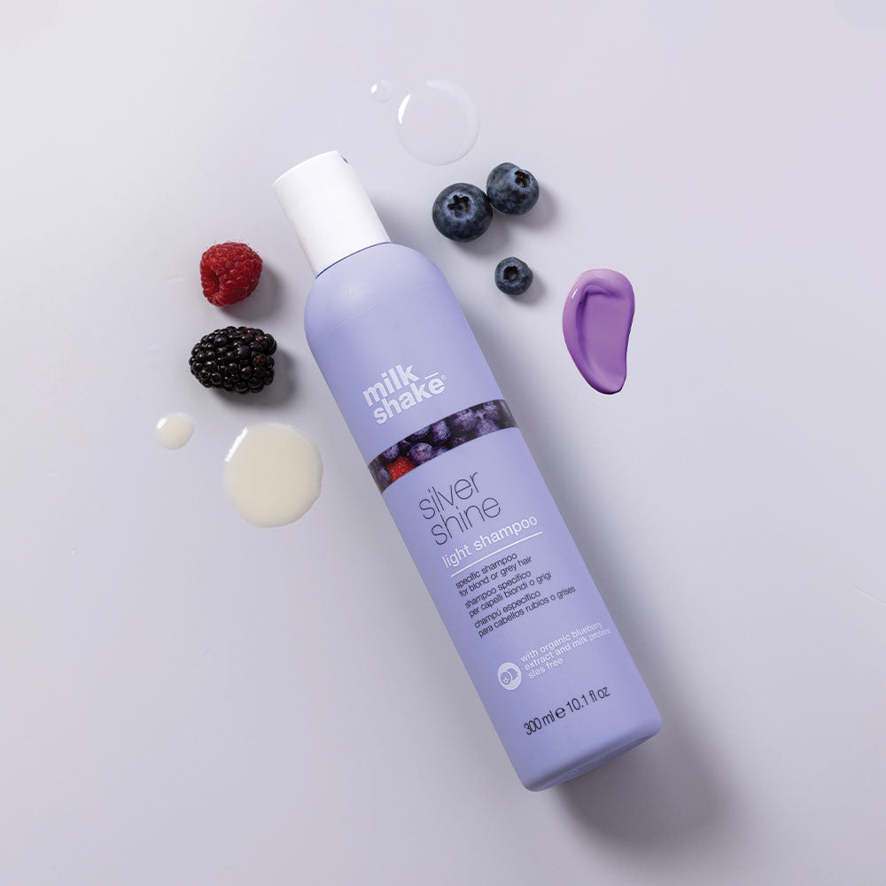 milk_shake silver shine light shampoo counteracts unwanted brassiness with 50% less violet pigments. Integrity 41® protects colored hair from fading caused by frequent washing & UV damage. To restore hair, milk proteins condition strands & strengthen hair structure. Washing with this purple shampoo leaves hair with a light fruity fragrance, courtesy of organic berry extracts.